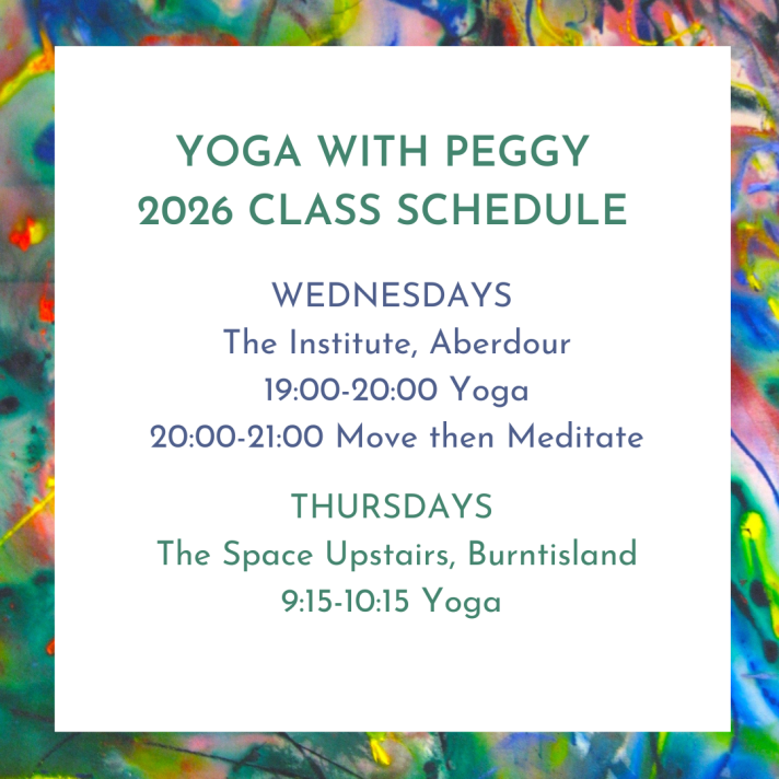 About the Venues: Wednesday evening Aberdour Classes take place at the Institute/Community Leisure Centre on Shore Road. Parking is very limited at the Institute, but nearby street parking and at the Train Station is available. Thursday morning Burntisland Class is at the Space Upstairs, whose entrance is beside Cafe Verde. Best to park in the nearby free Fife Council lot next the Links. Both venues are well-heated in winter and have toilets available.